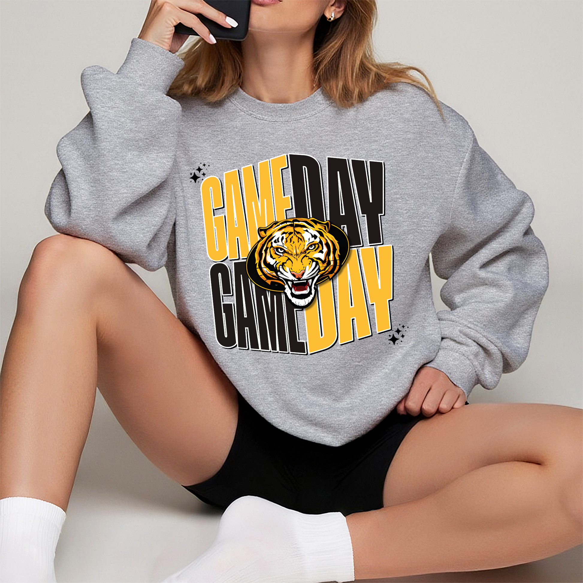 Show off your school pride in style with our Prairie Grove Tigers Game Day Crewneck Sweatshirt. Featuring a bold tiger graphic and “Game Day” lettering in black and gold, this cozy sweatshirt is perfect for football season, pep rallies, or everyday spirit wear. Made from a soft cotton/polyester blend, it’s designed for comfort, durability, and team pride.